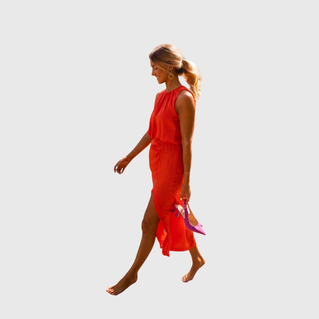 The Sally dress is your go-to for warm days when you want to feel polished yet completely at ease. Its softly draped halter neckline highlights your shoulders with a touch of modern elegance, while the elastic waist flatters your figure without feeling tight. The breezy front slit moves beautifully with every step — perfect for garden parties, sunset dinners, or simply adding a hint of allure to your day.